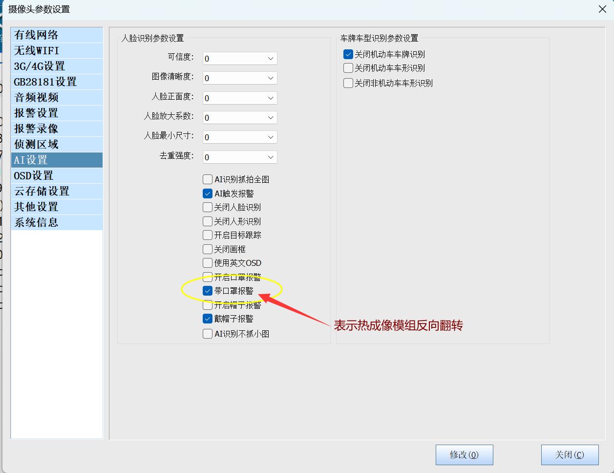 進(jìn)入4GCMS軟件--AI設(shè)置。勾選:戴口罩報(bào)警,即表示熱成像模組成像反轉(zhuǎn)。